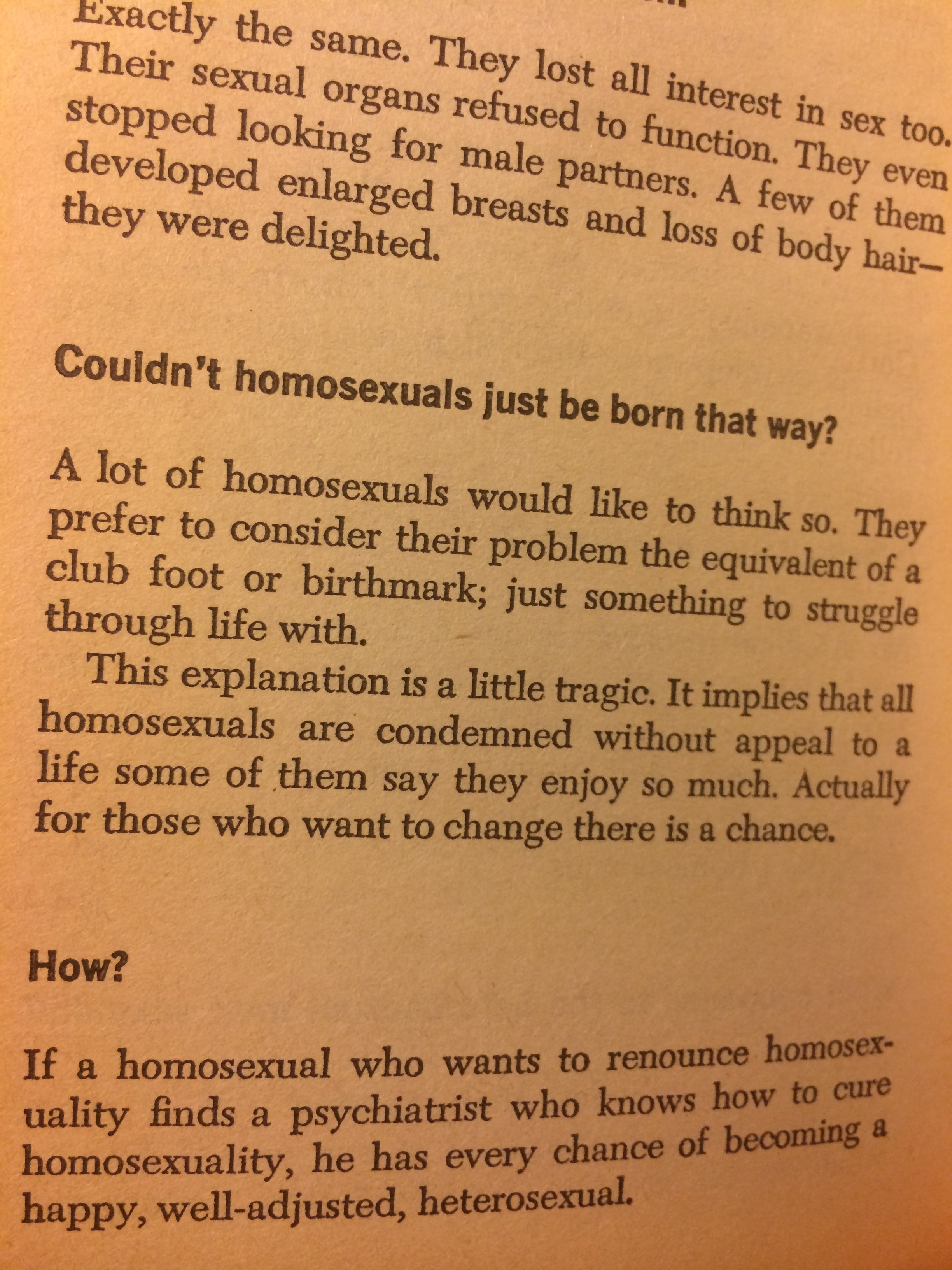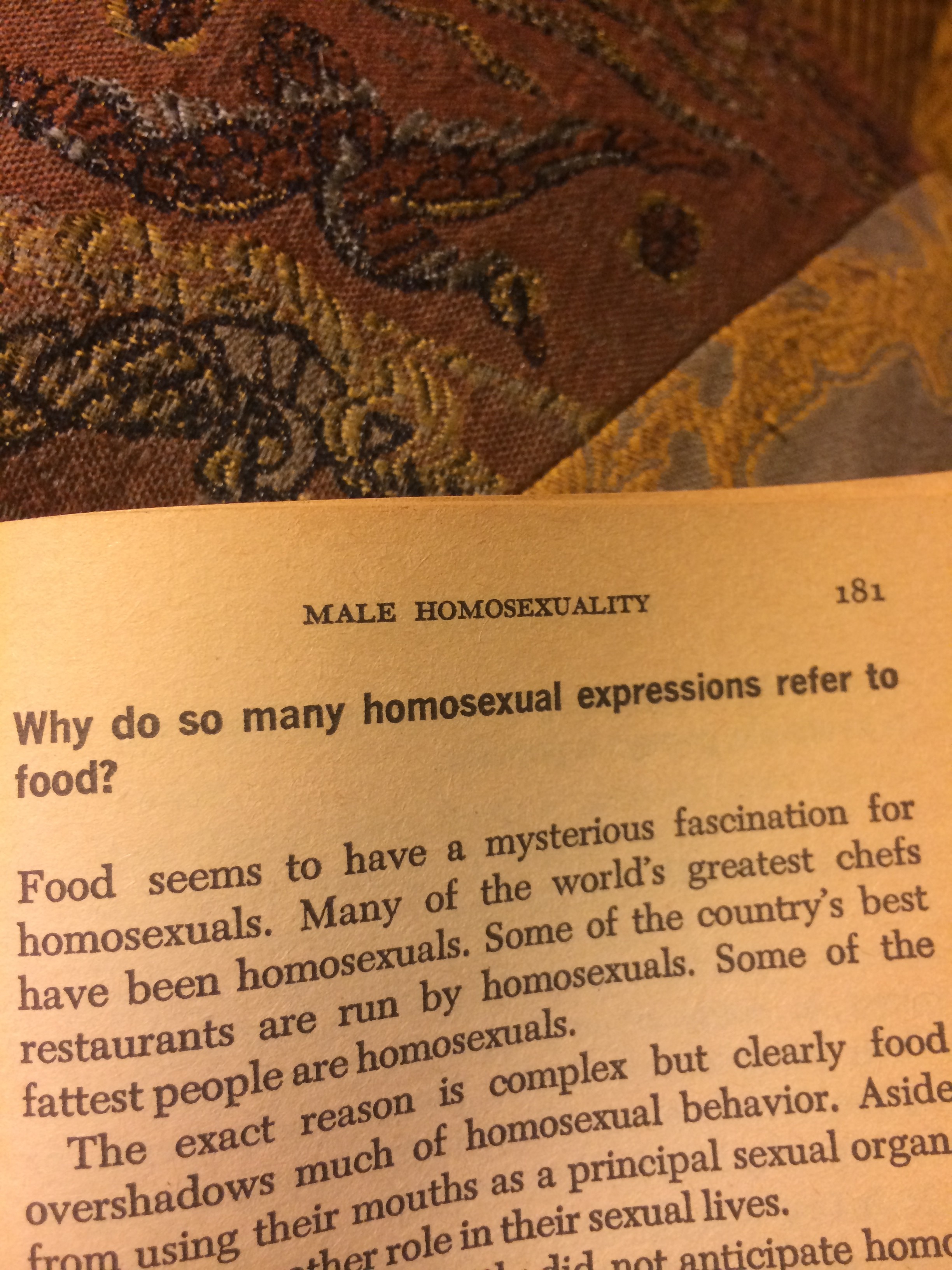 According to the book, miserable men picked up other miserable men in bowling alley restrooms when they weren’t busy living sad pathetic lonely frustrated lives.